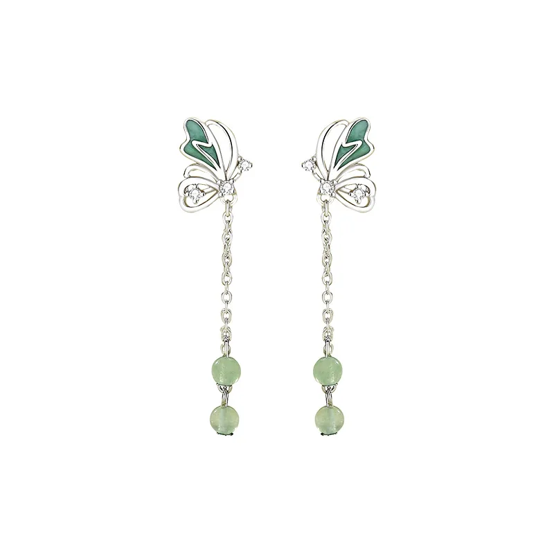 حلق نسائي بتصميم فراشة عصري مزين بأحجار براقة وكرات خضراء أنيقة متدلية.