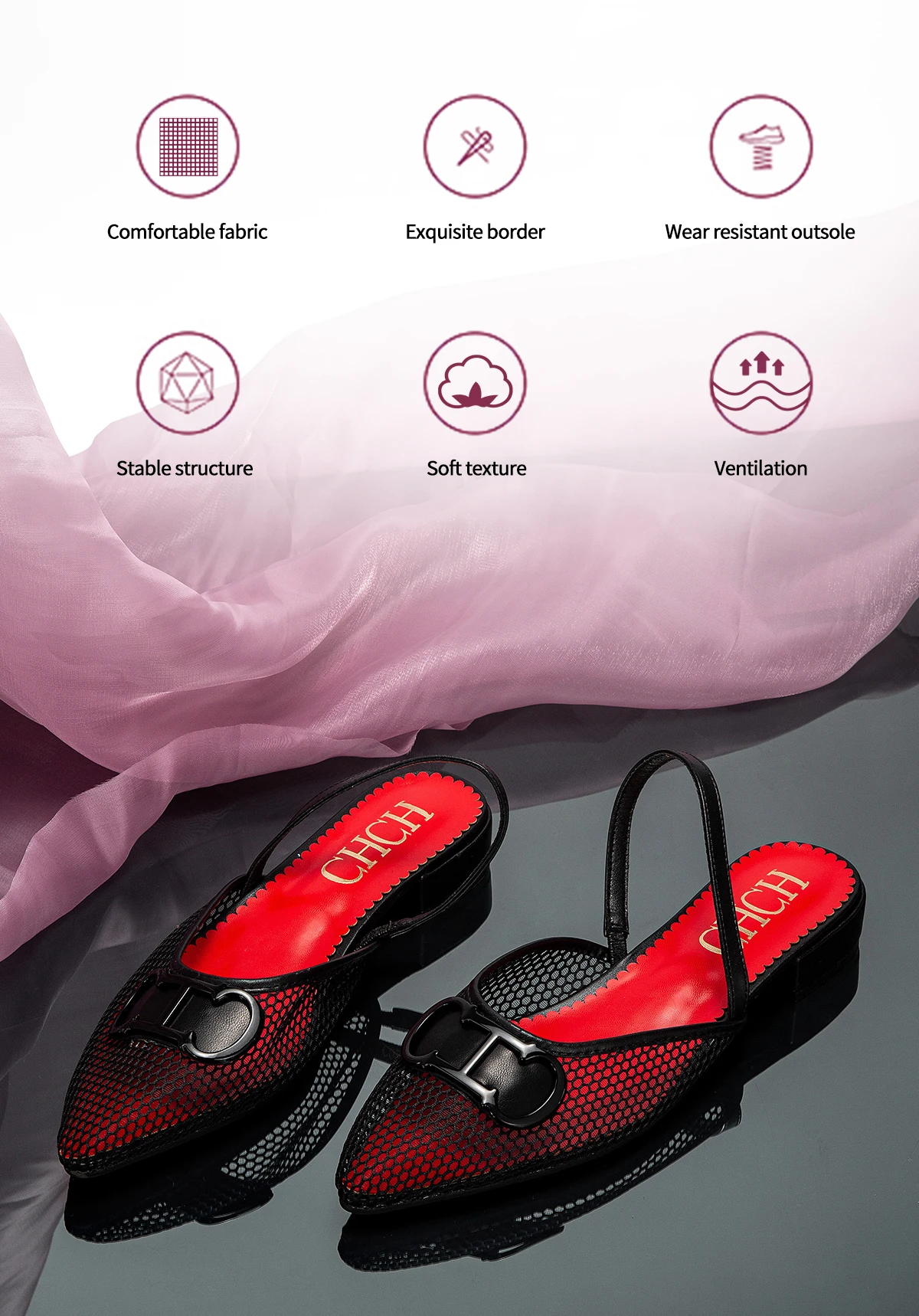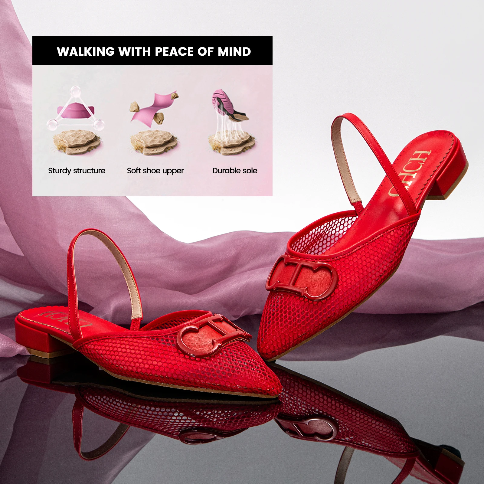 حذاء نسائي مميز بتصميم شبكي أنيق مع كعب مسطح يمنحك الراحة طوال اليوم. مصنوع من خامة متينة ومرنة مع نعل مقاوم للاهتراء وهيكل مستقر، مما يجعله مثالياً للإطلالات الكاجوال والمناسبات اليومية. يتميز بتهوية جيدة وملمس ناعم لراحة أكبر